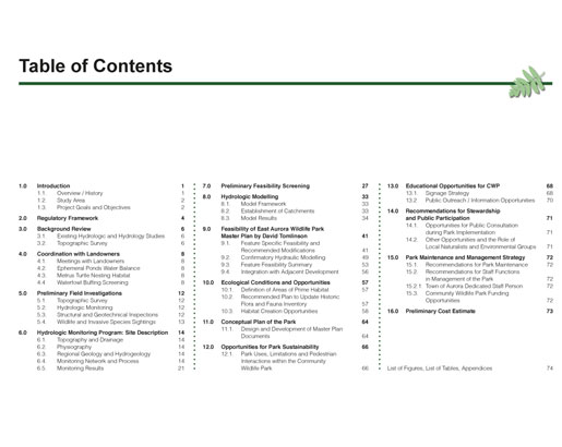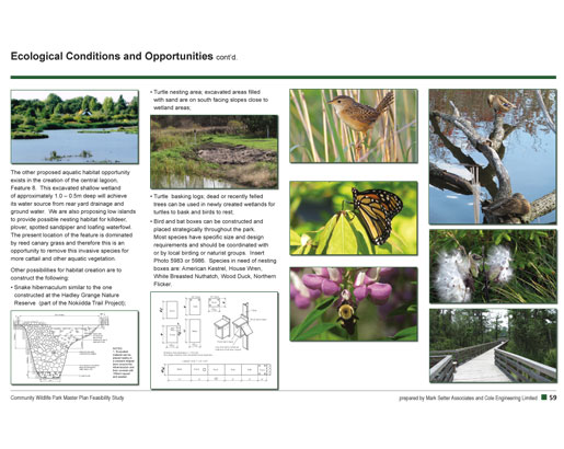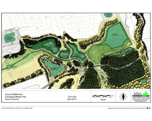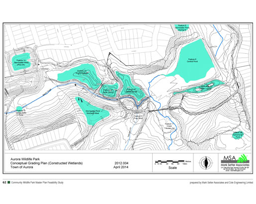 Mark Setter Associates, in conjunction with Cole Engineering Group Ltd. (Cole Engineering), are currently gathering necessary background data and information to prepare a comprehensive Community Wildlife Park (CWP) Master Plan within the East Aurora Wetland Complex. The final Master Plan will refine and articulate the concept envisioned by David Tomlinson's East Aurora Wildlife Master Plan (Concept) and East Aurora Wetland Wildlife Park Proposal Water Control System Concept. A major component of the plan will be to integrate all adjacent stakeholders requirements, including those from the Town of Aurora, developers within the 2C lands, Ministry of Natural Resources, Ducks Unlimited and the Lake Simcoe Region Conservation Authority.