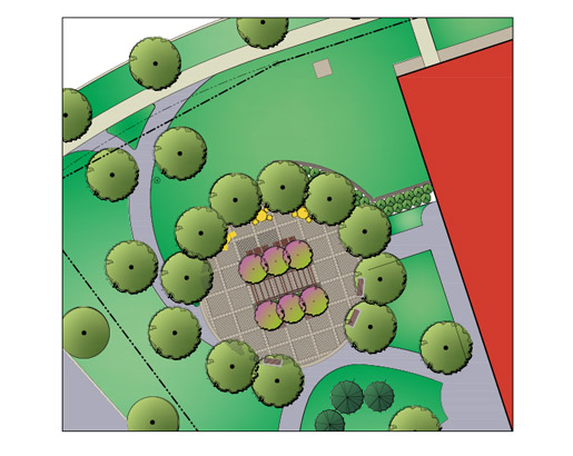 The proposed outdoor amenity space had to allow for an accessible route to a gathering area that could accommodate neighbourhood events as well as function more intimately for a seniors game of checkers or a family lunch. We proposed a circular centre hub with a linear central trellis encircled by trees providing shaded group and bench seating.